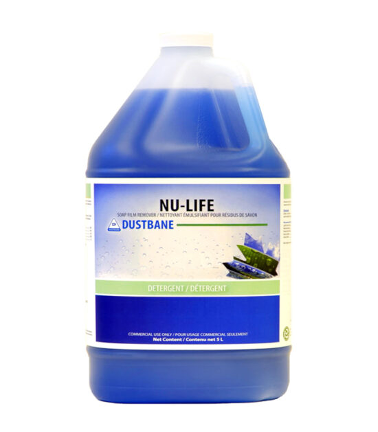 Dustbane Nu-Life 2000 Soap Film Remover, 5 Litres/1.3 Gallons. Penetrates and dissolves soap scum and hard water film, and other organic residues in showers, bath tubs, toilets and urinals, for easy and effortless removal, without the use of acid cleaners. Excellent for removing dulling soap film from floors, walls and fixtures in areas such as showers and washrooms. Dilute according to the dilution rates. Apply using an automatic scrubber, mop, sponge, cloth or trigger sprayer.