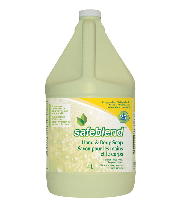 SafeBlend™ Hand and Body Soap is formulated to leave hands, hair and body clean, soft and fresh. Contains aloe vera to soothe and moisturize skin and is fragrance free. Suitable for food plant use in Canada.